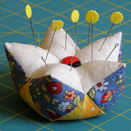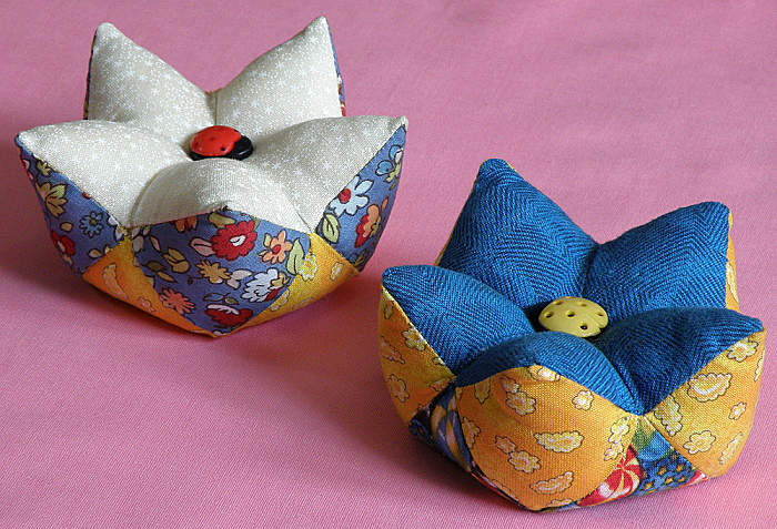 Пришивая последний квадрат, оставьте две нижние стороны не пришитыми. Выворачиваем изделие и набиваем наполнитель, зашиваем потайным швом оставшиеся две стороны квадратика. Длинной иглой пришиваем пуговицу, протыкая иглу насквозь - так Вы предадите игольнице больше "выпуклости".